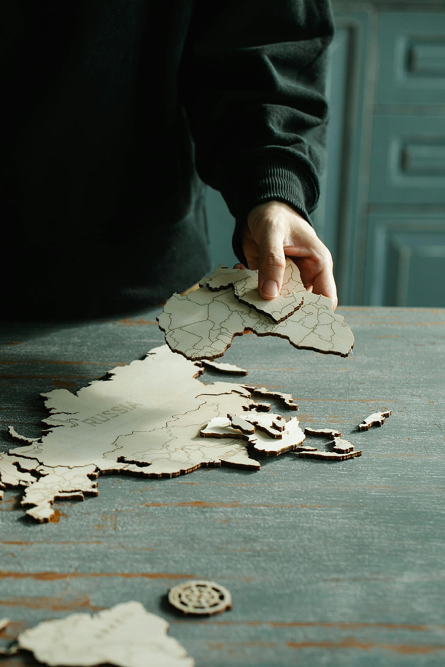 나무지도, 퍼즐 조립, 클로즈업 손, 나무 퍼즐, 지도 조각, 테이블 표면, 퍼즐 지도, 나무 조각, 맵 조립, 손을 조립합니다, 나무 퍼즐 지도