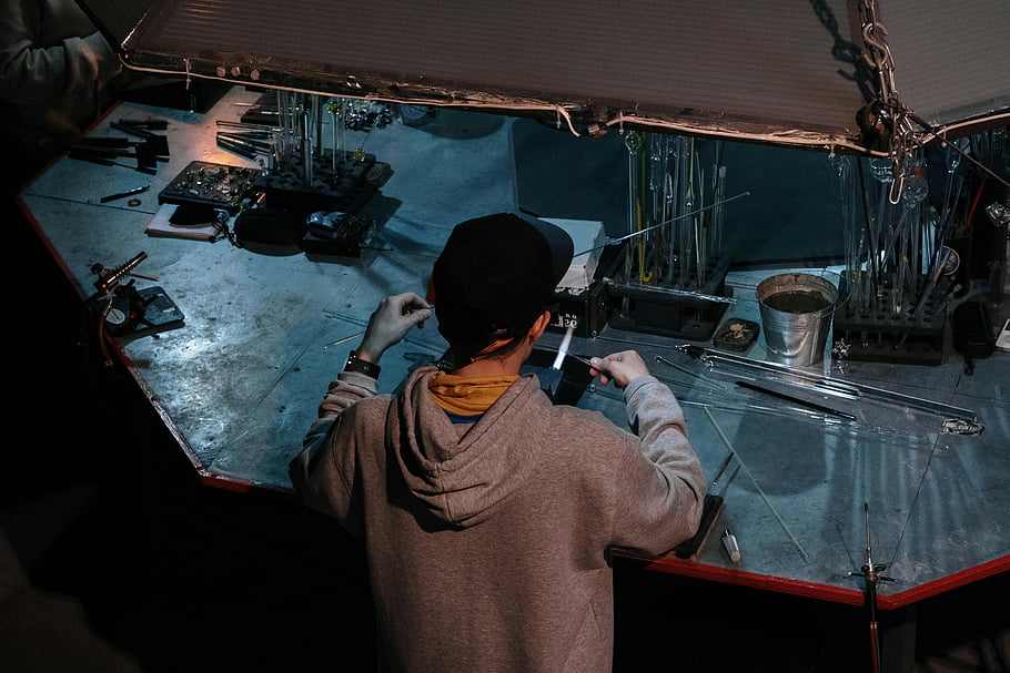 일하는 남자, 히트 건, 작업장, 제작 도구, 정도, 장인 정신, 유리 불기, 장인, 작업장 도구, 창조적 인 과정, 실습 작업