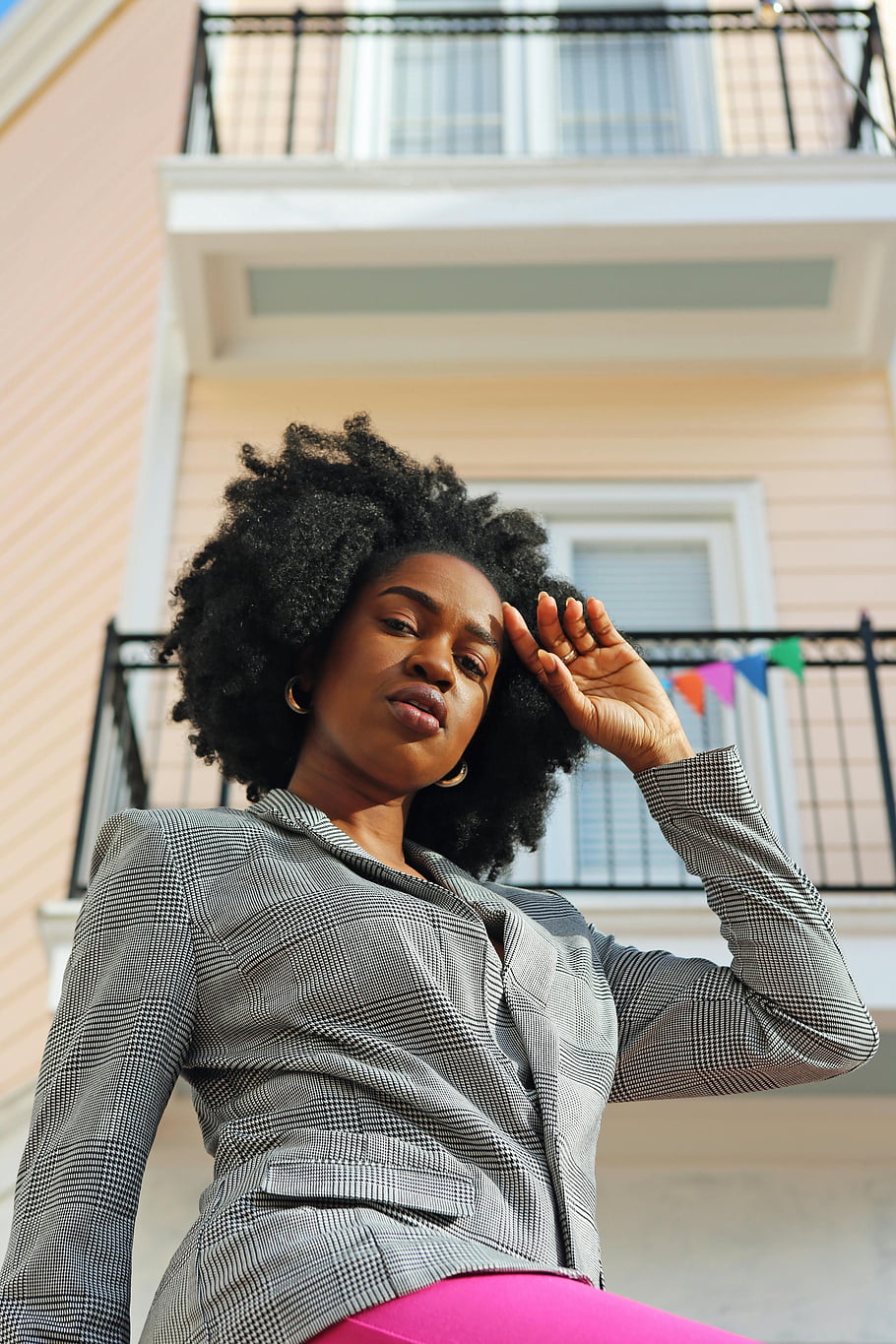 vrouw, zwarte blazer, modieuze outfit, buiten poseren, natuurlijk licht, zelfverzekerd, Street Style, stedelijke mode, chique look, moderne stijl, zwarte kanten top -