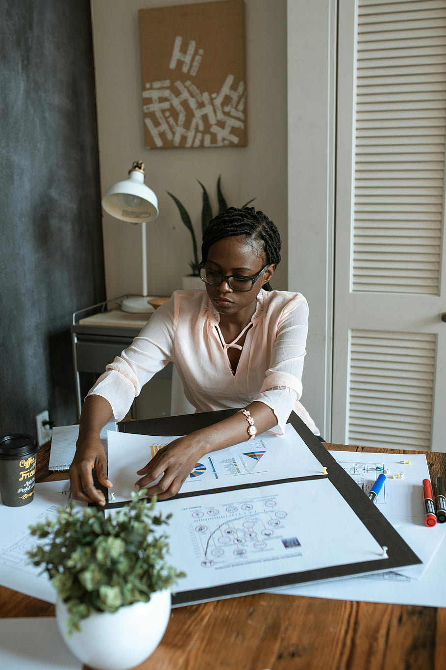 kvinna som arbetar hemma, fjärrarbete, hemmakontor, designprojekt, bärbar dator, färgstämplar, skrivbord setup, arbeta hemifrån, Professionell arbetsyta, kreativt arbete, hem arbetsytan -
