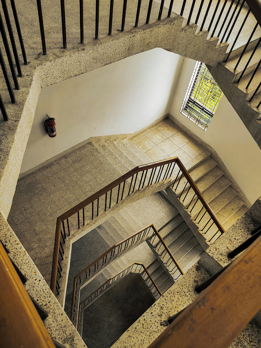 บันไดวน, ช็อตมุมสูง, มุมมองจากบนลงล่าง, ภายในอาคาร, ราวจับ, การออกแบบสถาปัตยกรรม, บันไดในร่ม, ขั้นตอนเกลียว, โครงสร้างอาคาร, สถาปัตยกรรมสมัยใหม่, การออกแบบบันได
