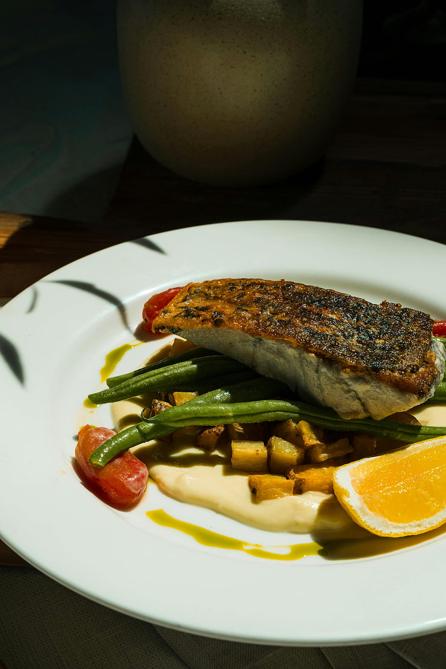 ปลาปรุงสุก, ถั่วเขียว, แซลม่อนย่าง, ผัก, อาหารรสเลิศ, จาน, การให้บริการที่สง่างาม, ภาพถ่ายระยะใกล้, จานปลาแซลมอน, ส้มฝาน -