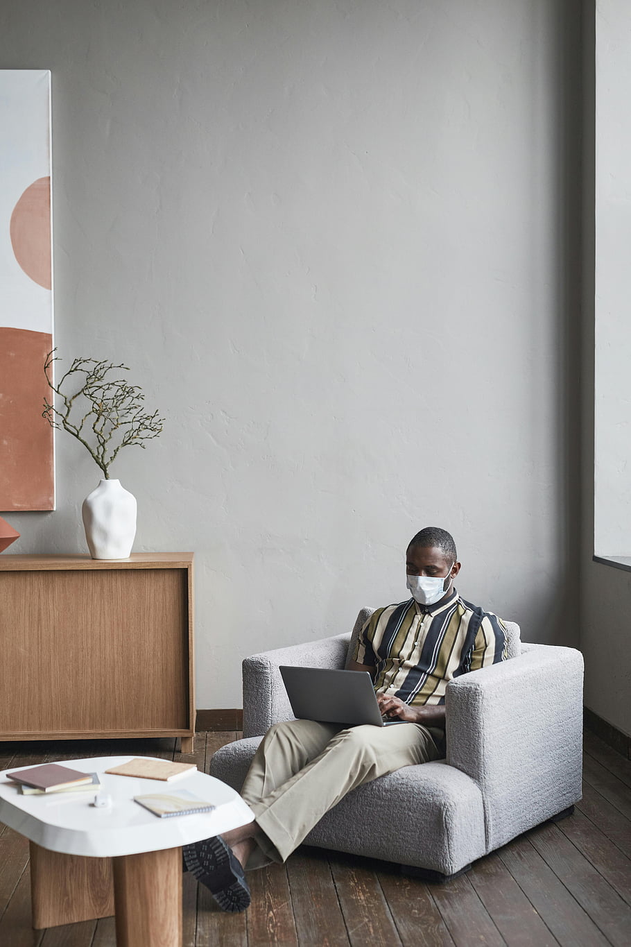 yüz maskesi olan adam, dizüstü bilgisayarda çalışan, uzaktan çalışma, iç mekan ayarı, koltuk, dizüstü bilgisayar kullanımı, yüz maskesi, kapalı çalışma alanı, çalışan adam, koltuk işi